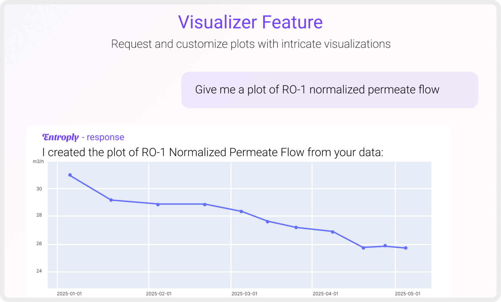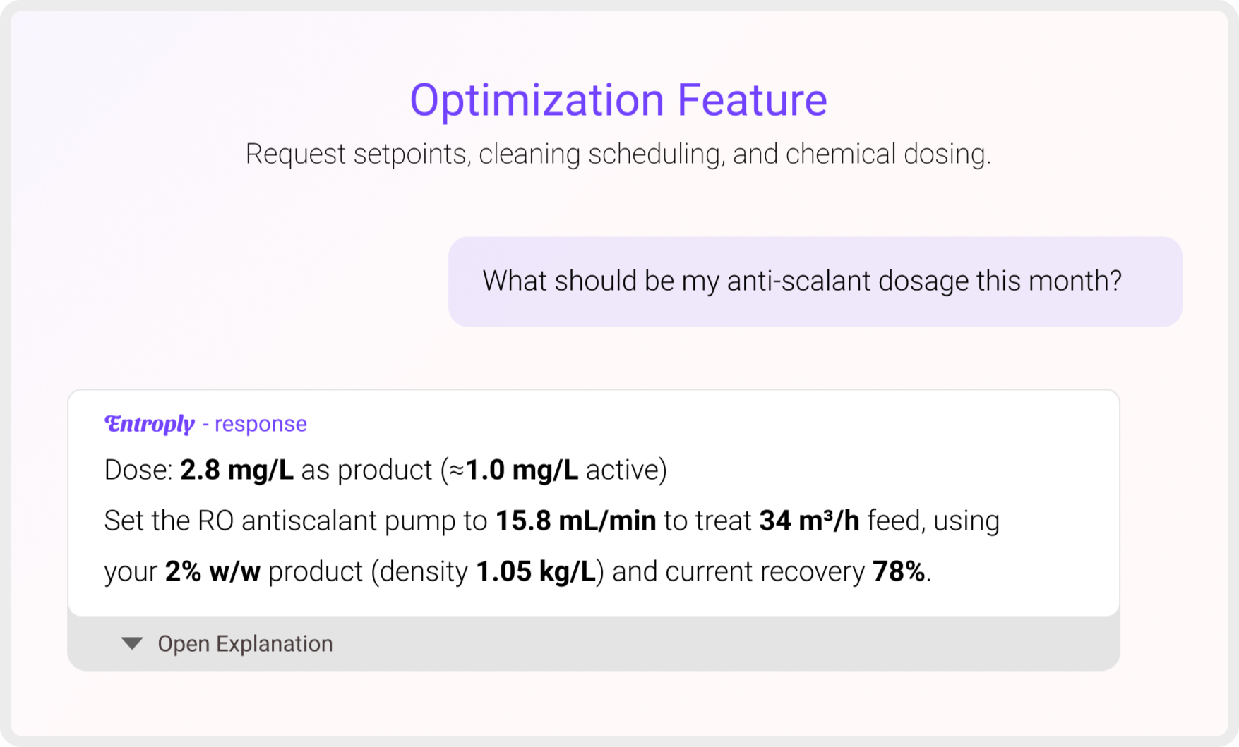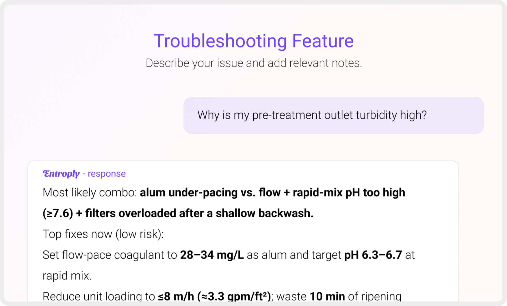 Water treatment guidance software. A clean interface where you can ask for any graph, check your data, or get clear troubleshooting guidance. Designed for teams that value clarity over complexity. No confusing dashboards, no black-box AI.
